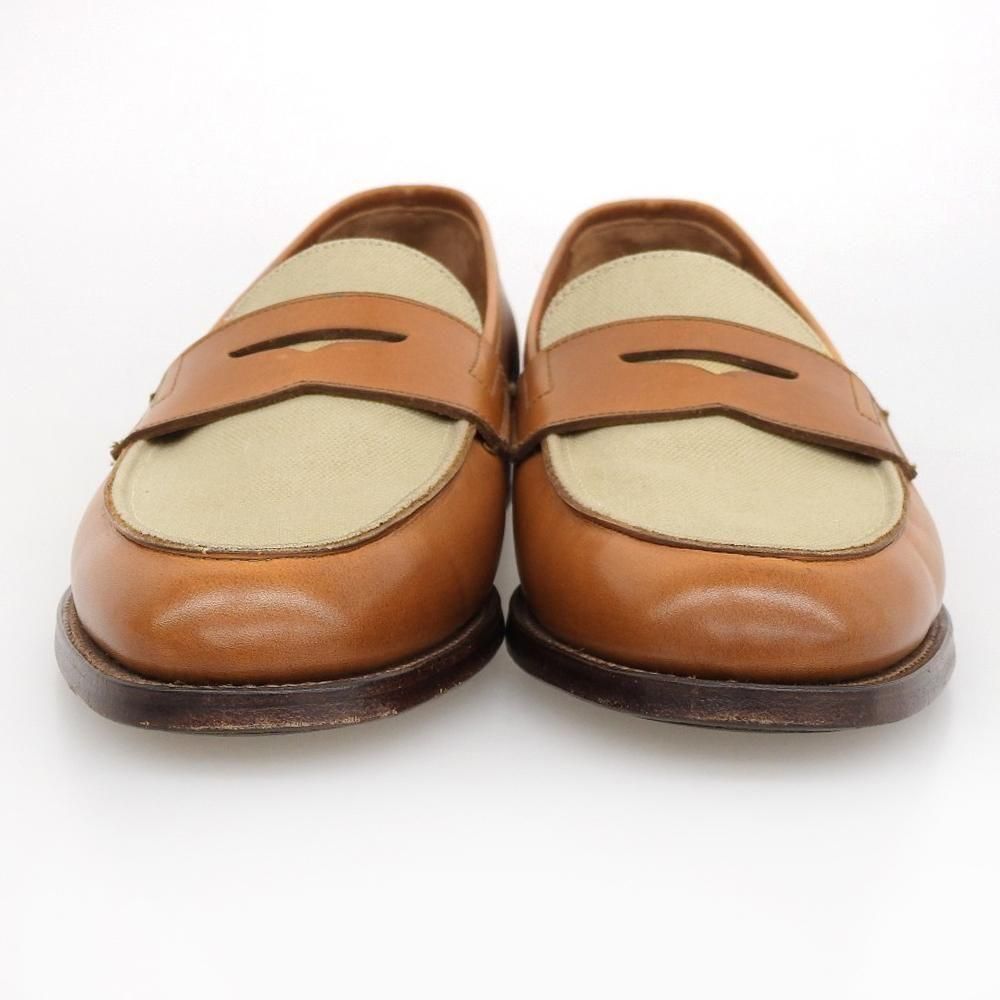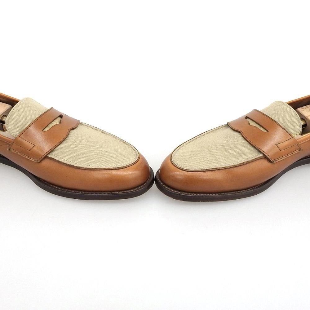 柔らかな足入れが魅力のアンライニング仕様のコインローファー。キャメル系のブラウンカラーとアイボリーのキャンバスのコンビは脱力感のある雰囲気でウィークエンドにおすすめの一足です。着用1、2回程度の極美品です。
